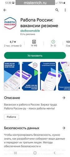 Информационная система, разработанная совместно с Центром занятости, предлагает более 1 000 000 вакансий от работодателей, чья репутация подтверждена на государственном уровне. Разработчик — skolkovomobile.