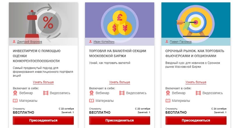 - Наличие обучающих курсов и материалов для новичков. Даже инвестору с опытом и познаниями в финансовой сфере сложно разобраться во многих азах, секретах, нюансах и тонкостях. И, если брокерская компания кроме лицензии, высокого рейтинга и приемлемых тарифов способен еще и обо всем рассказать – то жизнь станет в разы легче.