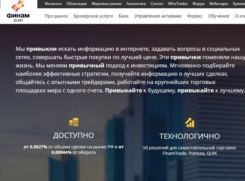 Брокер ФИНАМ представлен на российском рынке с 1994 года. Представительства этой компании открыты в более чем 90 городах по всему миру, а посреднические услуги предлагаются в 70 странах. Количество клиентов по состоянию на 2019 превышает 239 тысяч человек. Компания имеет более 50 почетных наград.
