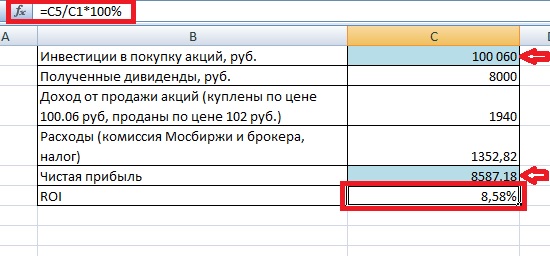 Рассмотрим пример расчета ROI по инвестициям в акции.