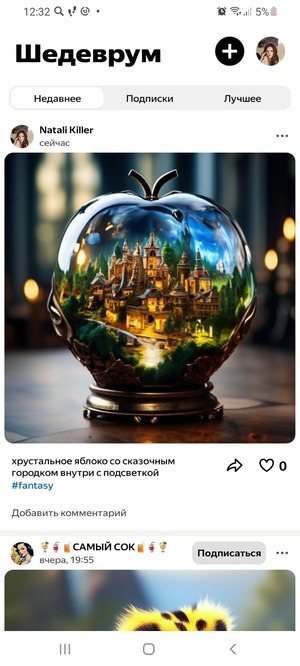 Юзеры подписываются на лидеров мнений, кто уже научился создавать правильные и подробные запросы и получать потрясающие результаты. Уже на данном этапе намечаются тренды в социальной сети (например селфи животных, погружение в воду, хрустальное яблоко с начинкой внутри), где люди копируют запросы друг друга и делятся своими работами. В раздел «Лучшее» попадают посты, набравшие наибольшее количество реакций.