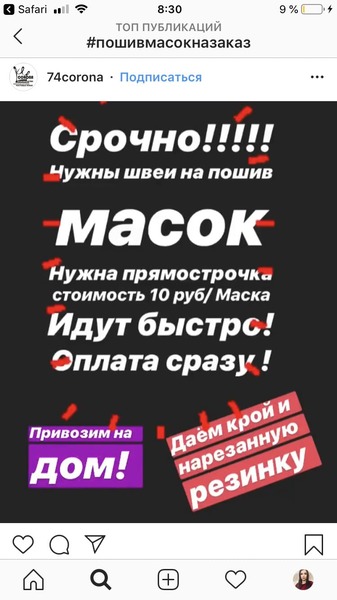 На досках объявлений все чаще можно встретить объявления с предложением пошива или склейки масок на дому. Оплачиваются такие заказы в среднем от 5 до 30 рублей за штуку. Такая подработка на время карантина может принести вам дополнительный доход в 1000-2000 руб. в день. Важно! При поисках такого заработка остерегайтесь мошенников! Не платите никаких авансов и гарантийных взносов!