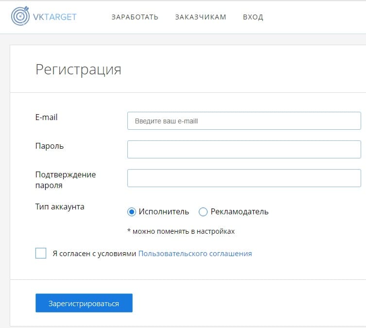 - Также потребуется выбрать тип регистрируемого аккаунта (рекламодатель или исполнитель). В первом случае человек будет размещать задания, во втором выполнять.