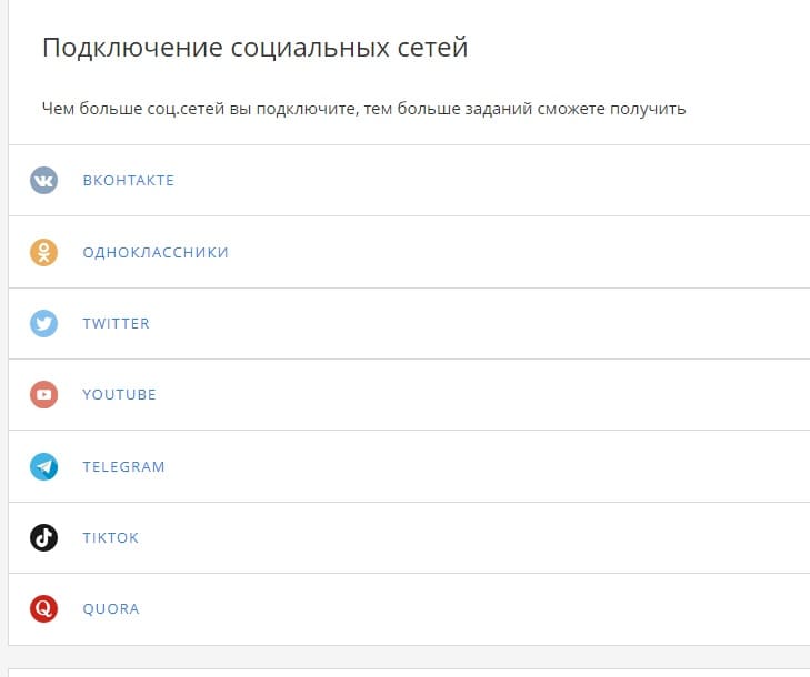 Также потребуется привязать к своему профилю аккаунты ВКонтакте, Инстаграм, Твитер. Это поможет увеличить поток предлагаемых заданий и уровень дохода . Чем больше привязанных страниц, тем выше доход. После успешной регистрации можно приступать к работе.