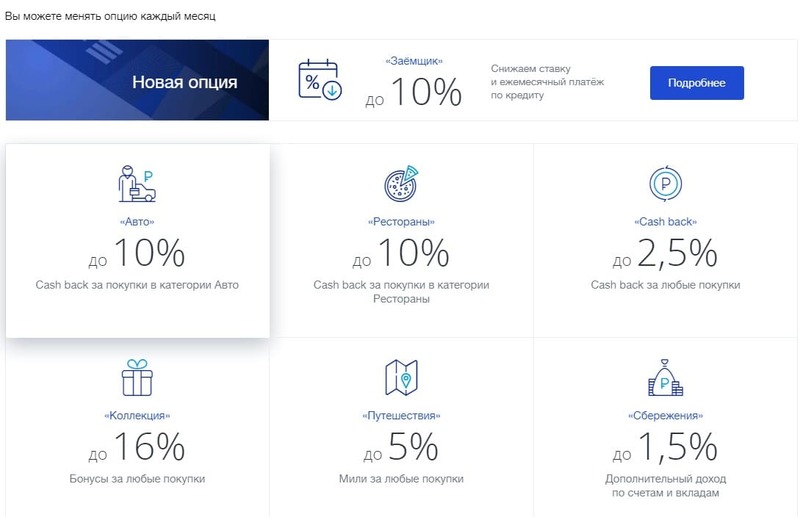 - возможность выбрать одну из 6 бонусных опций для начисления кэшбэка с наиболее подходящими для себя условиями;