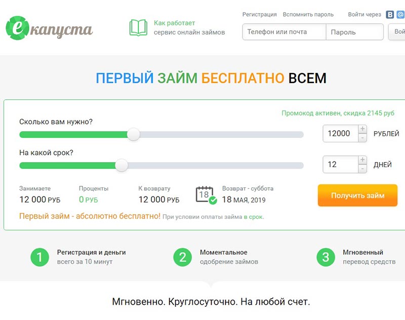 Организация под названием Vivus.ru кредитует от 3000 до 30000 руб. заемщиков с положительной историей платежей. Первый займ с нулевыми процентами до 10 дней. Срок погашения от 1 до 30 дней. Деньги поступают на карту, наличными, банковский счет и QIWIкошелек. Сайт: vivus.ru