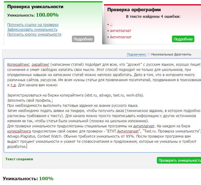 - Для проверки уникальности предусмотрены специальные программы на антиплагиат. На каждой из бирж копирайтинга предусмотрен свой сервис для проверки – “ETXT.Антиплагиат”, “Text.ru. Проверка уникальности”, Advego.Plagiatus, Сontent Watch. Обычно требуется уникальность от 95%. После проверки программа вам выдаст процент уникальности и укажет те словосочетания и предложения, которые не уникальны и требуют доработки.