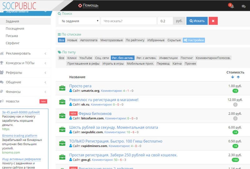 - socpublic — минимальные выплаты на Qiwi от 1 копейки. Стоимость 1 задания от 20 копеек до 260 рублей.