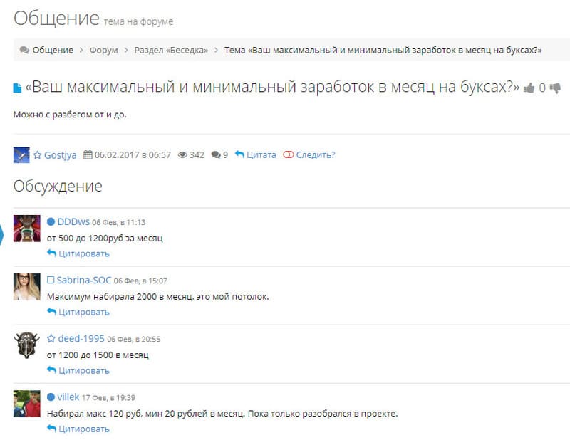 В интернете достаточно отзывов о заработке на кликах. Из положительных моментов пользователи отмечают главное преимущество такого вида фриланса — для него не нужно обладать какими-либо специальными знаниями. Основными минусам же являются низкая оплата (в день можно заработать не более 200-300 рублей), а также большое количество времени, которое надо потратить для того, чтобы хоть что-нибудь заработать. Смотрите ниже скриншот с форума на сервисе Socpublic, где реальные пользователи делятся размером своего заработка.